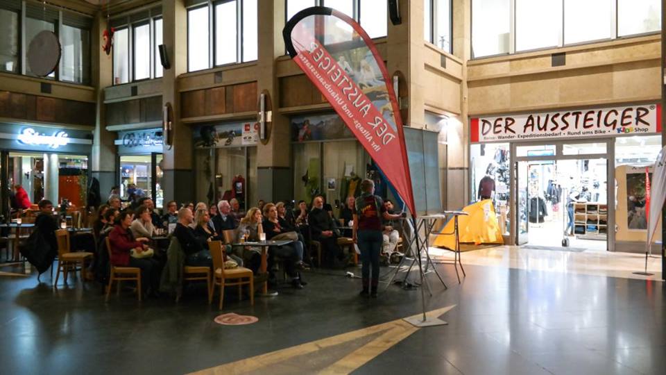 My two-month stay in Germany came to a nice end last week: In addition to a cheerful carnival party in my home village of Ferch, I taught a yoga class on Monday and had a lot of pleasure to present my tour offers in front of a nice audience in the Wilhelm Galerie at the Outdoor Store ” Der Aussteiger” in Potsdam! I am glad that so many have come and also about the great help of friends and acquaintances! Manu in particular helped to make the evening a success!