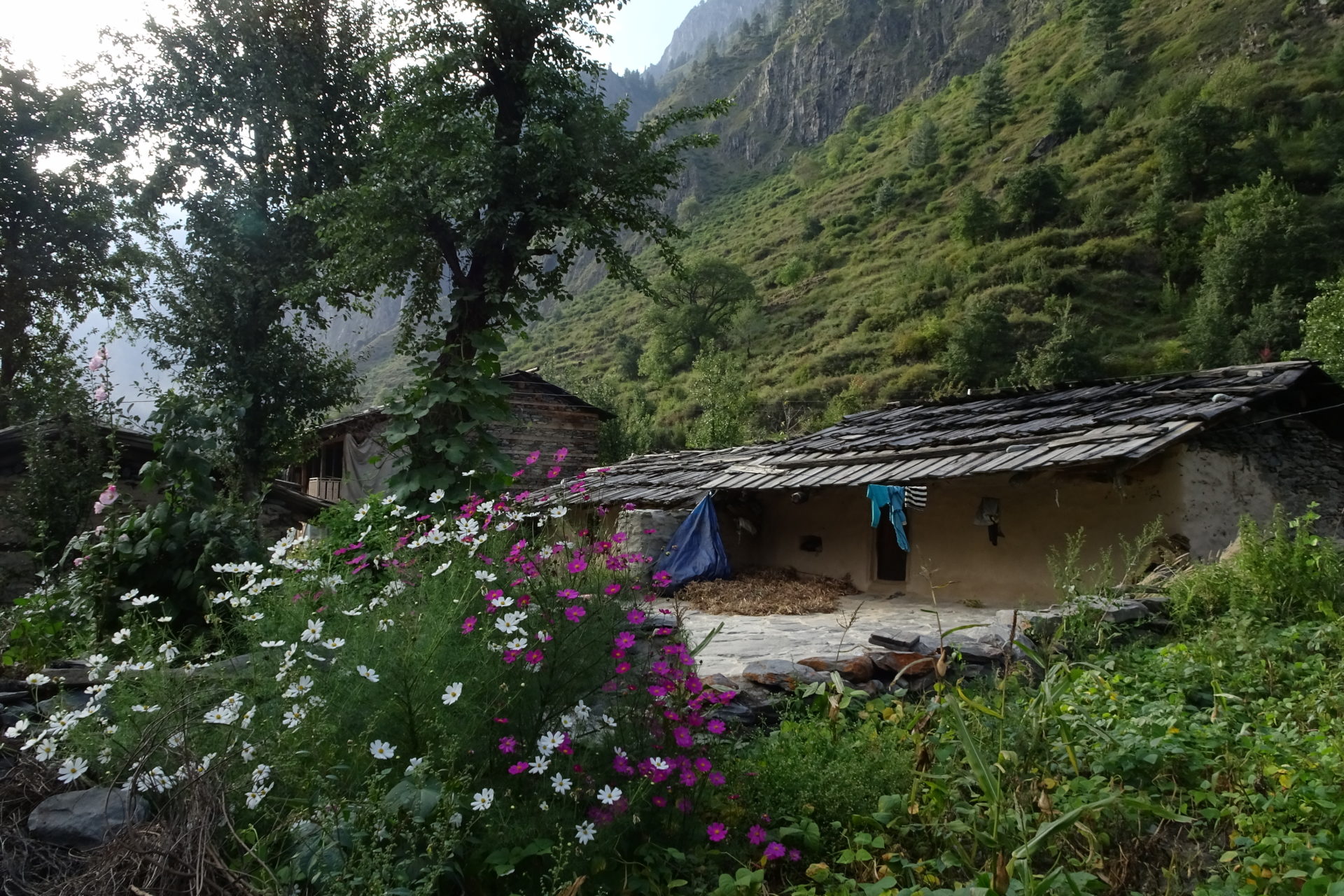 There is no electricity, the houses are built completely of wood including the roof. The villagers grow kidney beans, potatoes, peas, some vegetables for their own needs and also little bit of cannabis. (In winterseason, people move across the Pass to Bir to sell one or the other product). They also have cows, sheep and goats. Fruit trees and small gardens are located between the houses and are lovingly maintained and there is even a school on the other side of the river.
