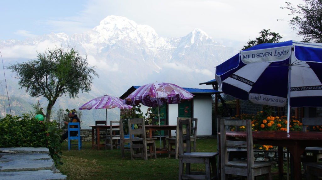 After a short but steep ascent, the tree line is reached and you have a clear view of the mountains in front of you: Mardi Himal (5,587m), Machapuchare (6,993m), Annapurna South (7,219m) and Hiunchuli (6,441m).